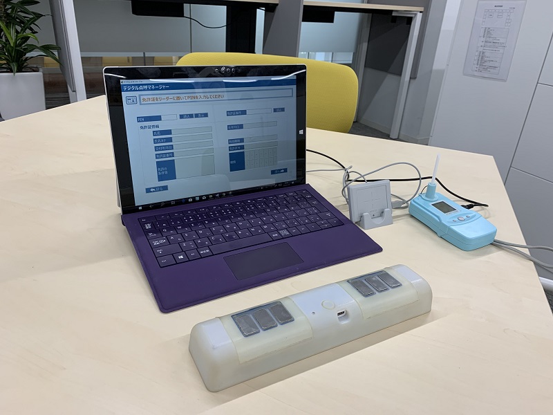 計測は写真のパソコン前にある白い測定機に40秒ほど両手を置くだけです。