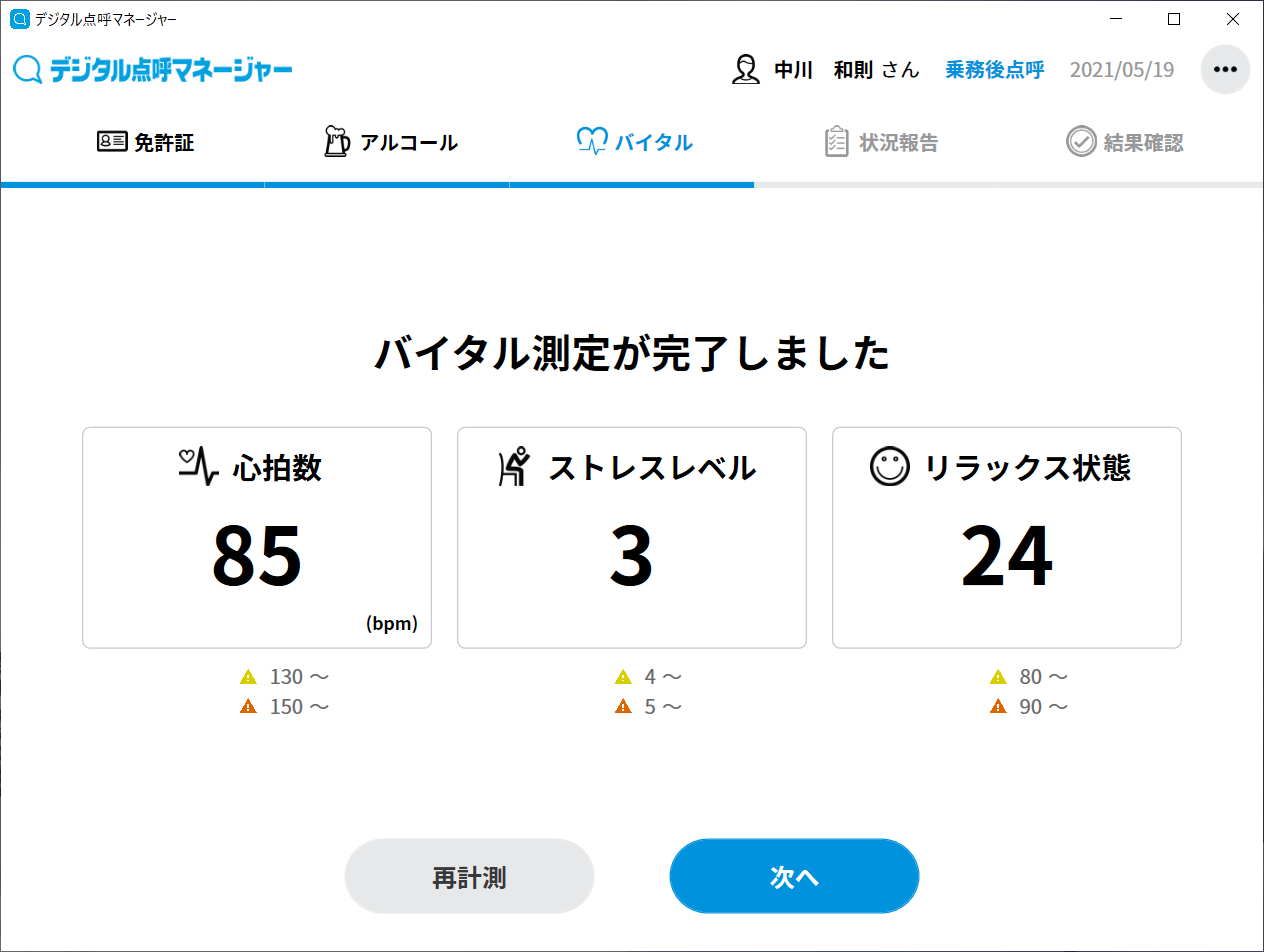 異常数値がみられる場合は、システムが自動で警告し、運行管理者とドライバーで情報共有することで、乗務前の体調の変化など気づきを与え、定量的判断が可能です。