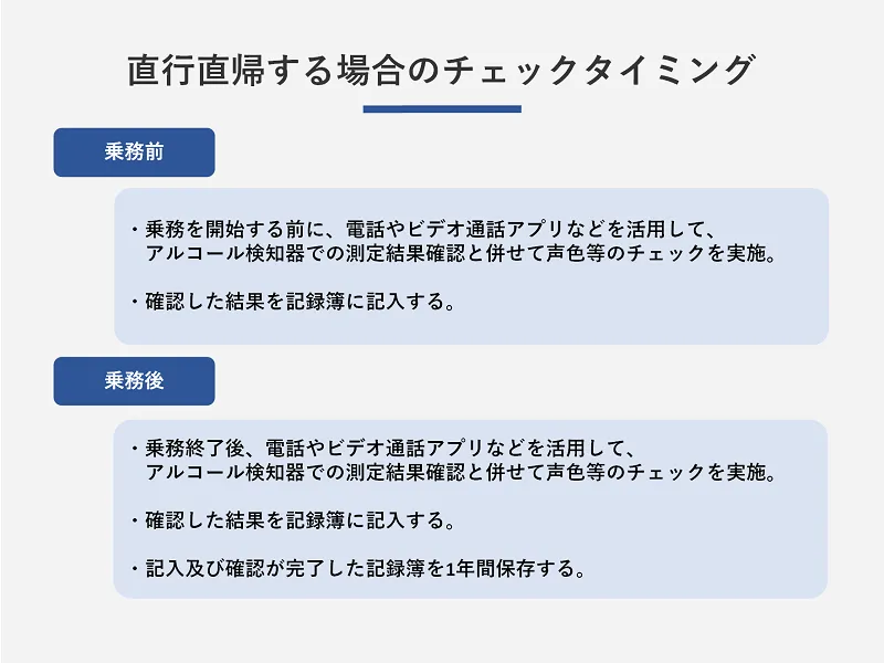 | 直行直帰ドライバーへの適用 | 「乗務前後のアルコールチェック」「記録」は直行直帰でも免除されない |