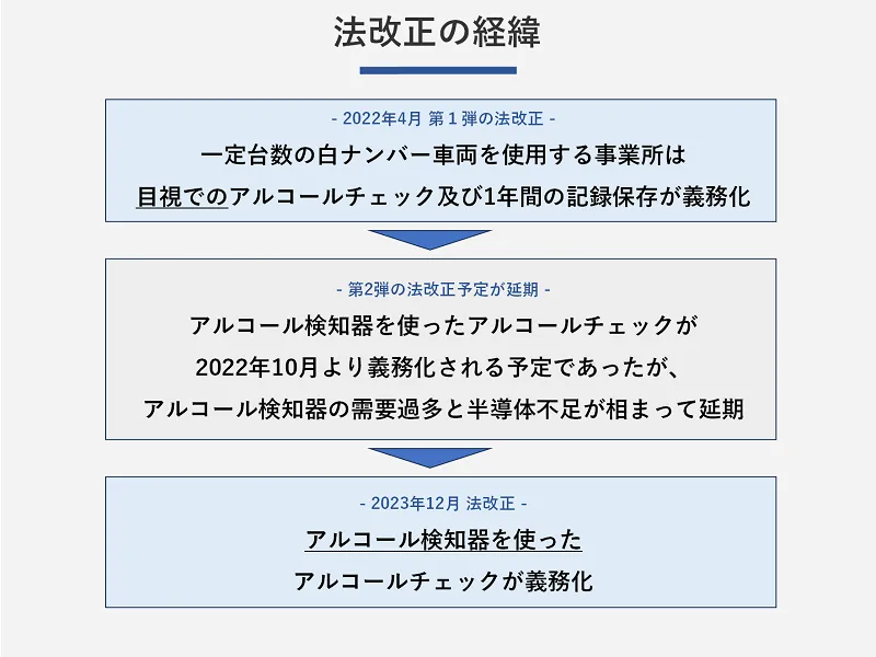 もともと飲酒運転の抑止目的で進められてきた制度ですが、近年の交通事故件数や社会的な安全意識の高まりを受け、企業に対してより強い責任が課されるようになりました。