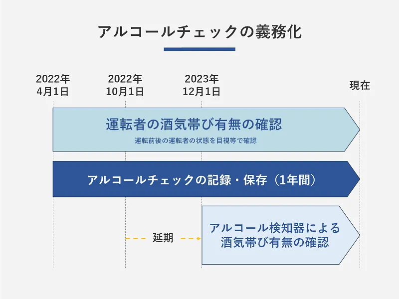 第二段階の改正では、2022年10月からアルコール検知器を使用して酒気帯びの有無を確認することが義務化される予定でしたが、当時、半導体不足により十分な数のアルコール検知器を供給することが不可能となり延期になりました。その後、2023年12月1日に改正法が施行され、アルコール検知器を使用したチェックが義務化されました。