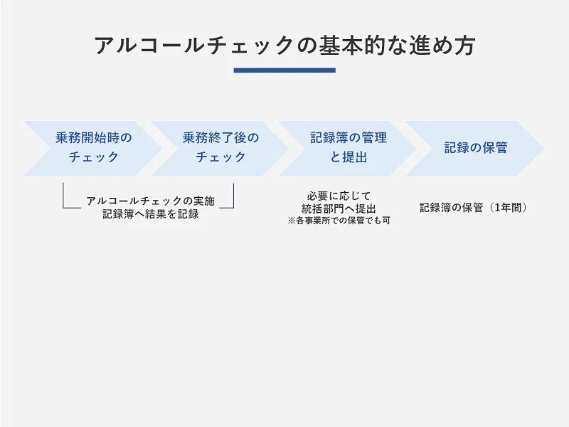 アルコールチェックは、安全に業務を遂行する上でとても重要なプロセスです。運転業務に従事する従業員には、厳格なチェックと記録が求められます。以下では、アルコールチェックの実施手順について解説します。