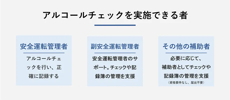 本来、アルコールチェックは安全運転管理者が行うべきものですが、安全運転管理者が不在の場合などもあります。下記では、アルコールチェックが実施できる、安全運転管理者や副安全運転管理者、補助者について解説します。