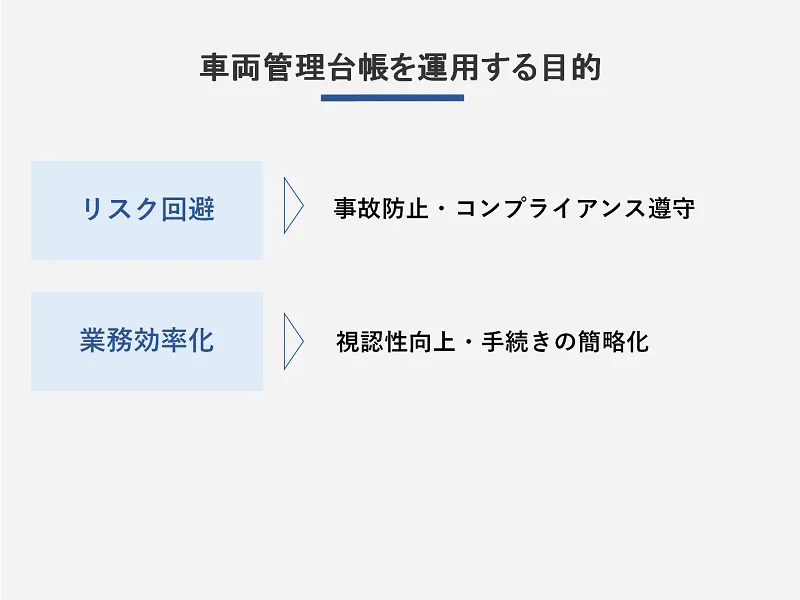 車両管理台帳を整備する最大の理由は、事故やトラブルを未然に防ぎ、安全・効率的な運行を実現することにあります。そのためには、車両の安全性が担保されていることがとても重要です。さらに、リスクを把握・管理することで、経営的損失を未然に防ぐことにも繋がります。車両を複数台保有する企業や営業所を構える事業者にとって、車両管理台帳は経営インフラの一部ともいえます。