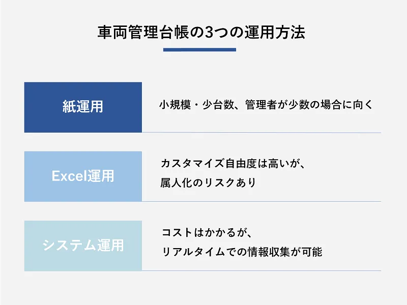 車両管理台帳をどのように運用するかは、企業の規模や管理担当者のスキル、予算などによって変わります。大きく分けると、「紙で運用する」「Excelで運用する」「システムで運用する」という3つの方法が考えられます。それぞれにメリットとデメリットがあるため、自社の状況を踏まえて選択しましょう。