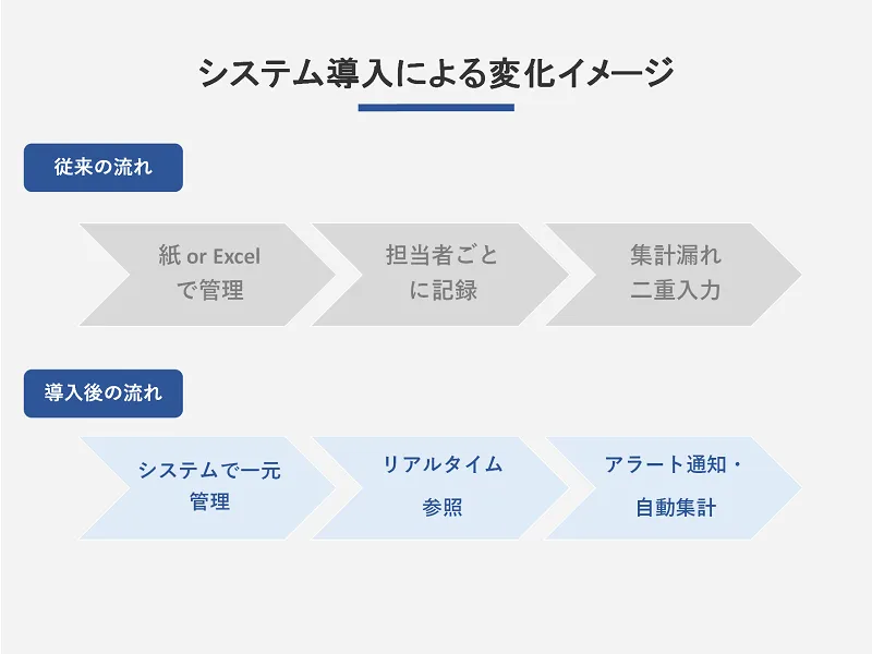 車両管理システムを導入すると、車検や保険更新日が近づいたときに自動的にアラートを出せるなど、ヒューマンエラーを大幅に減らす仕組みが整います。