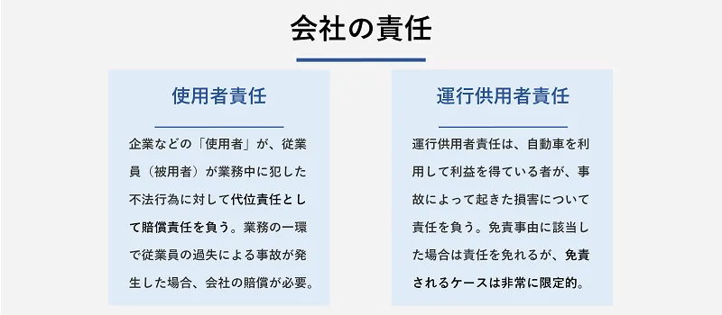 この責任は主に「使用者責任」と「運行供用者責任」の2つに分類され、事故の状況に応じて会社が負うべき責任の範囲が決まります。それぞれの責任について詳しく見ていきましょう。