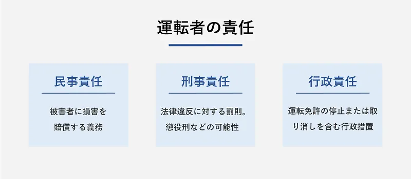 社用車を運転中に事故を起こした従業員は、「民事責任」「刑事責任」「行政責任」の3つの責任を問われることになります。以降では、それぞれの責任について詳しく解説します。