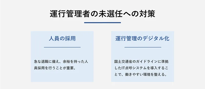 こうした事態を防ぐためには、人員の計画的な採用や、IT点呼をはじめとするデジタル化の推進といった具体的な対応策が不可欠です。