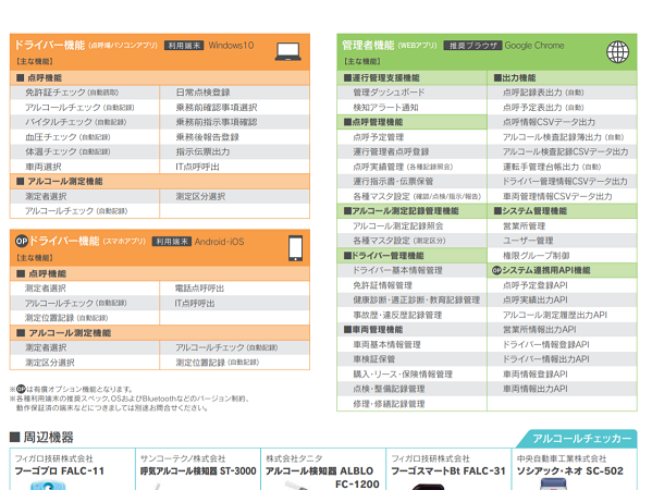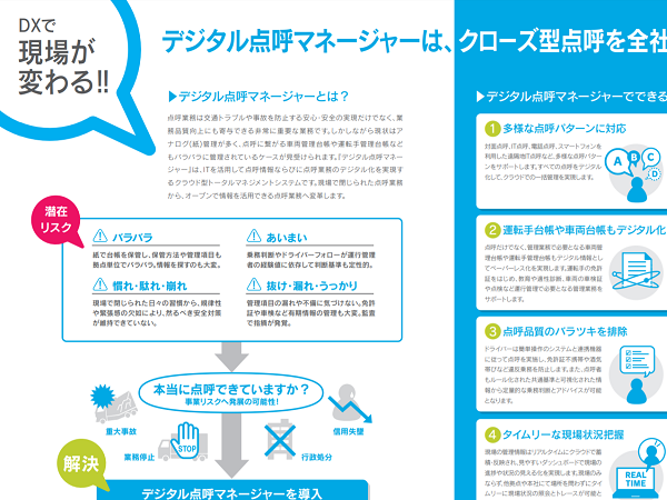 デジタル点呼マネージャーの特長、機能等をご紹介したリーフレットです。