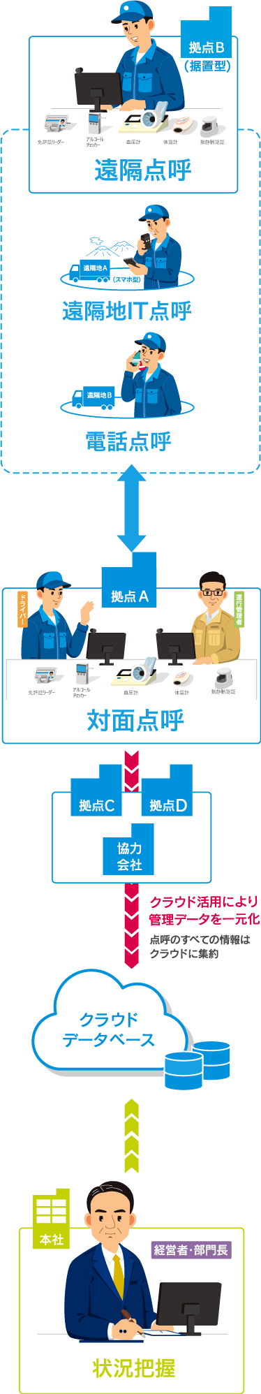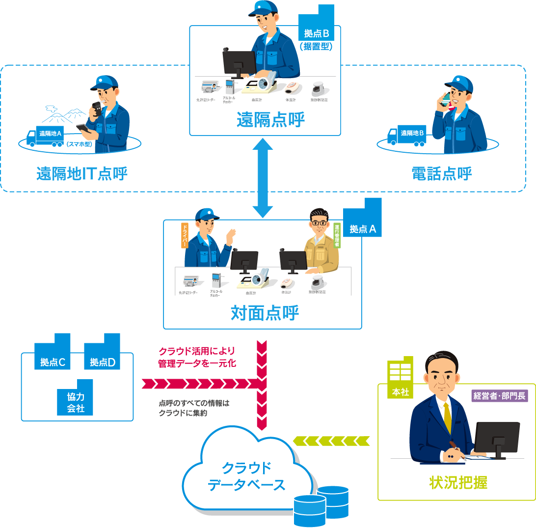 各拠点で行った、各種点呼の管理データをクラウドデータベースで一元管理。