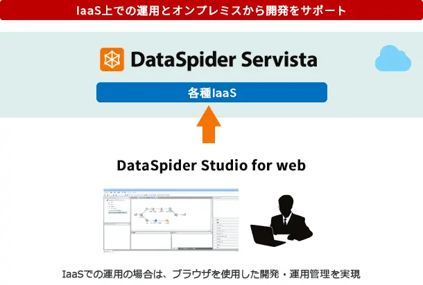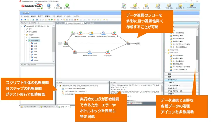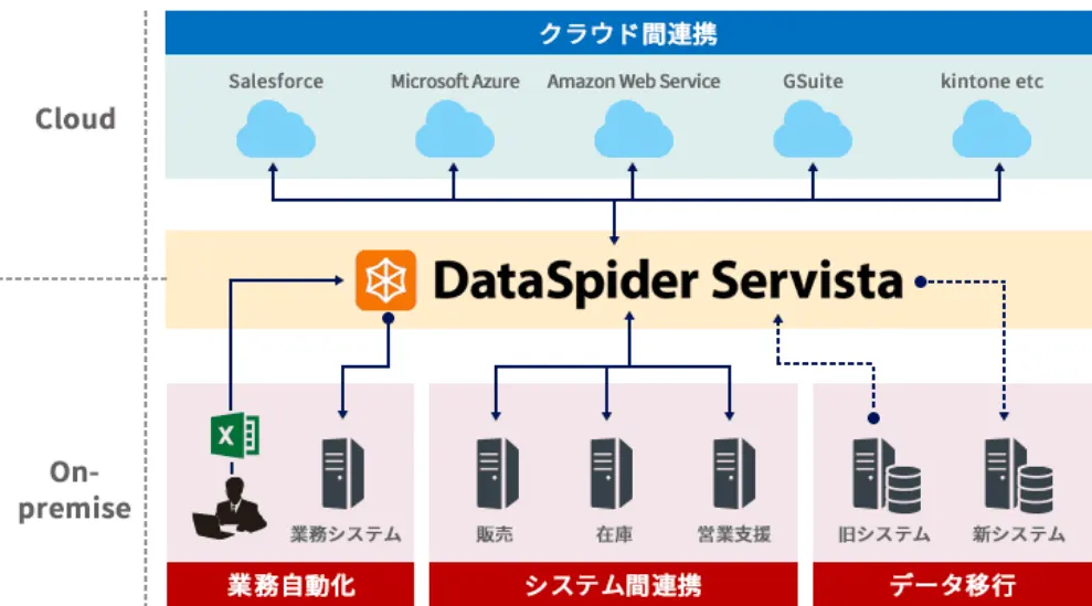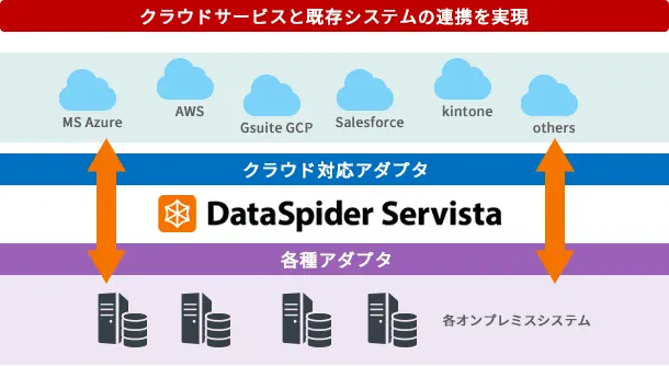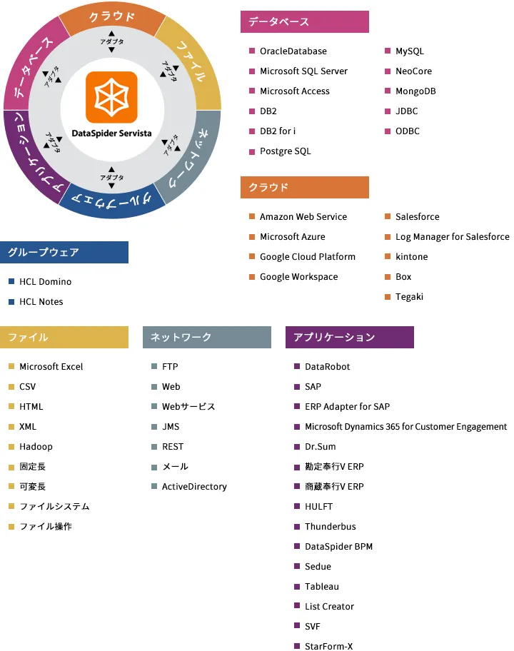 DataSpider Servistaは各種システム・データソースに対してデータをつなぐHUBとしての役割を担い、各種システム・データソースの開発においてもGUI開発により早期にシステム・データ連携基盤を構築できるデータ連携統合基盤です。