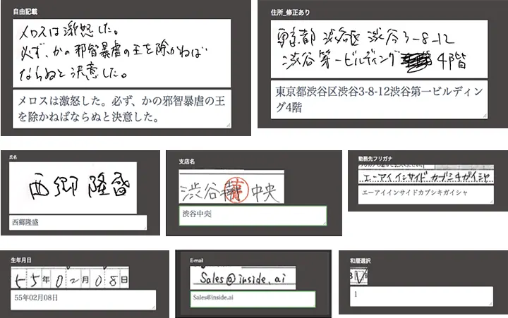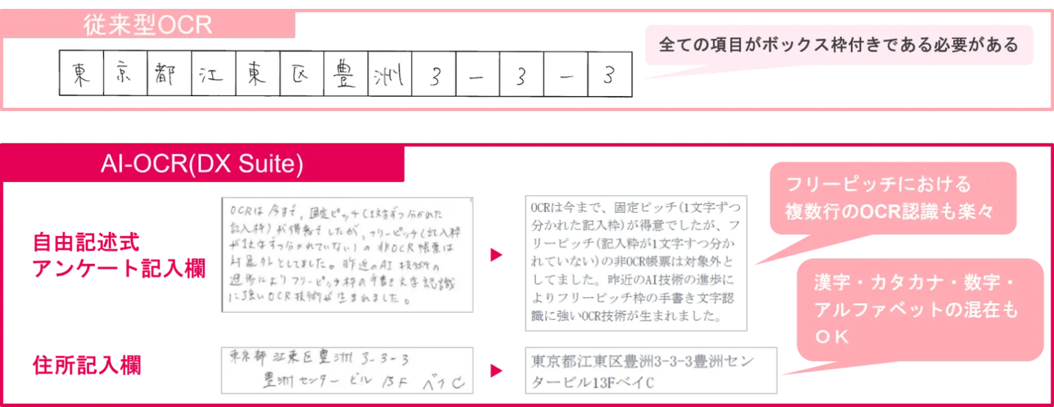 従来型OCRでは文字と文字のつなぎ目や切れ字を判別することが困難でしたが、AI技術が加わったことで自由記述式の記入欄(フリーピッチ)や複数行で書かれた「手書き文字」の高精度な認識が可能となりました。