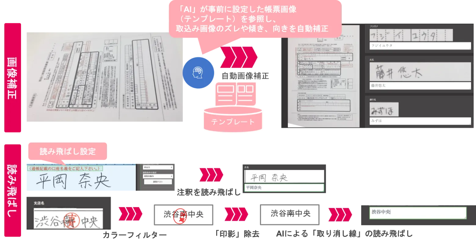 「DX Suite」は、「AI」による優れた自動画像補正と、OCR認識対象文字付近の「注釈」や「印影」を「読み飛ばす」機能により、従来型OCRでは困難だった、「ズレ・傾き」や「影」がある例外的な帳票画像でも高精度に読取ることができます。