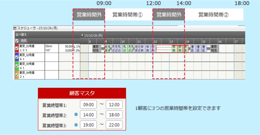 以上を整理すると、顧客の営業時間帯は ①09:00~12:00、②14:00~18:00、③19:00~22:00となる