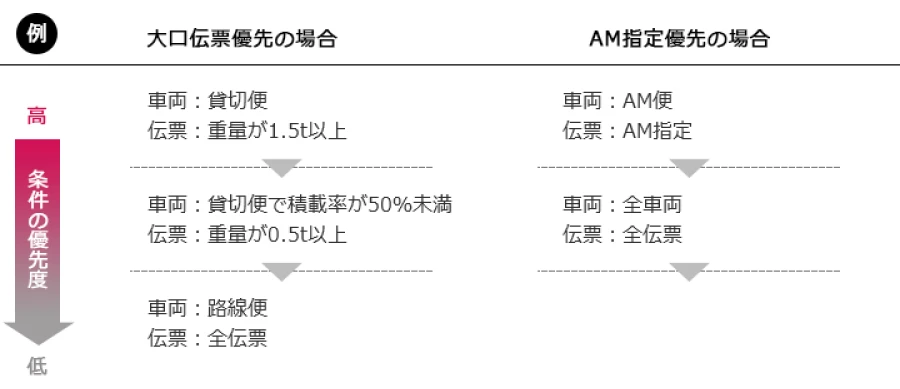 顧客や商品の優先度を基に配車条件を設定し、配車計算を一括実行します。複数条件を一括計算するため、配車業務の時間を短縮しつつ、配車担当者のノウハウを反映した配車条件のもと、配車計画作成を実現します。こうした配車パターンを登録・更新することで常に精度の高い配車計画を維持します。
