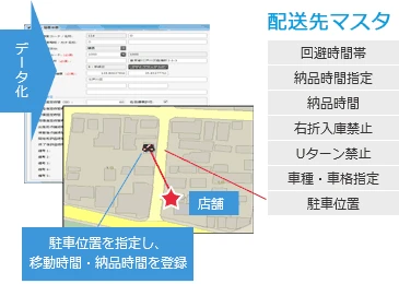 熟練の配車担当者やドライバーが持っている納品要件(配送先への接車や納品条件)のノウハウを顧客マスタとしてデータに反映することができます。マスタ化することで、納品要件を考慮した配車計算を機械的に行うことができます。
