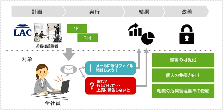 疑似的な標的型メールを実際に体験学習を行うことができる教育プログラムです。