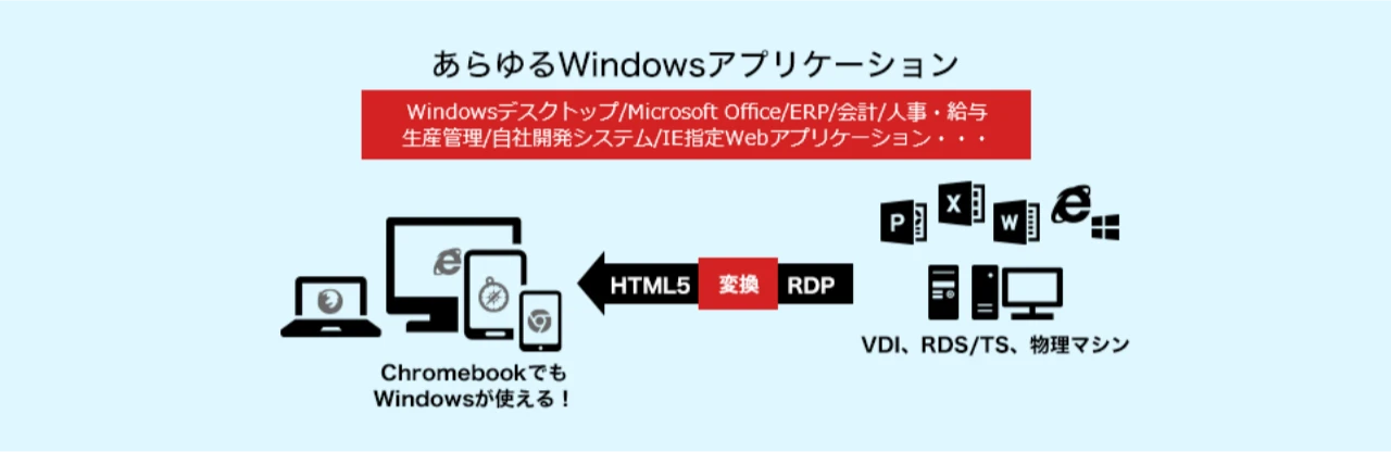 デスクトップやアプリケーションの実行環境は、サーバ側となるためユーザ端末の更新によって業務システムが正しく動かなくなるなどの問題を避けることができます。