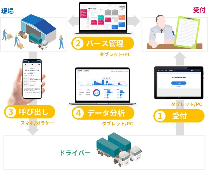 トラックの受付やバース事前予約により、荷待ち時間、バースの混雑を解消