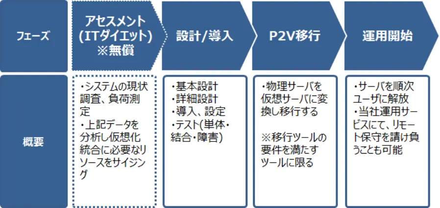 仮想化効果のアセスメントから、提案・設計構築・物理サーバの移行、運用管理までの