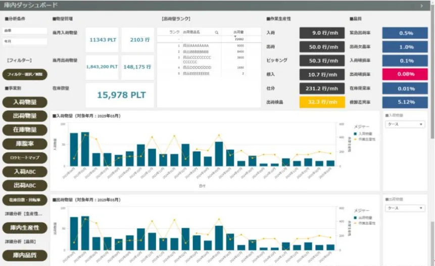 BIツールによる見える化機能を標準搭載。WMSデータを活用した、入出荷物量照会/ABC分析、在庫物量照会/在庫回転率/保管効率、生産性/品質管理など物流管理の強化に貢献します。